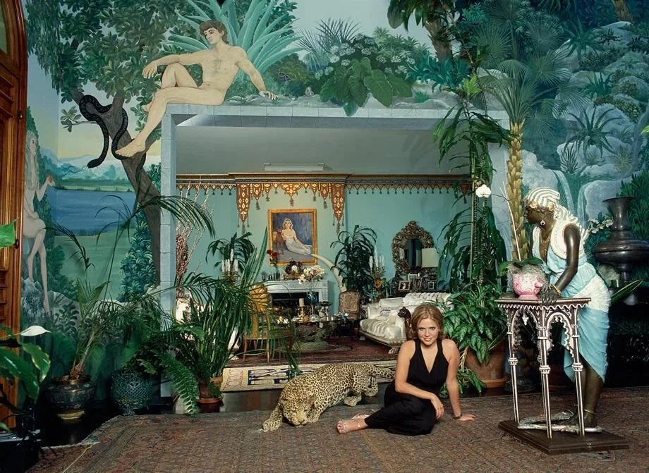 Earlier this year during a visit to the Phoenix Art Museum, a large photograph caught my friend’s attention. We walked over to see a photo of a woman wearing a black dress smiling as she looked straight into the camera. The room she was sitting in was complete with an abundance of house plants, tufted furniture, and a taxidermy leopard. The display of opulence was both kitschy and glamorous.